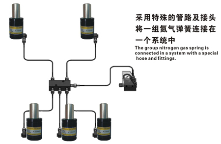 氮气弹簧管路系统:采用特殊的管路及接头,将一组氮气弹簧链接到一个系统中。